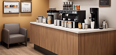 - Instalar una máquina de café espresso o una cafetera de filtro con una variedad de opciones de café, té y otras bebidas calientes.