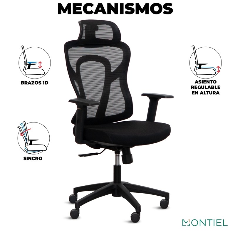 Esta silla de oficina tiene una gran variedad de ajustes que permiten al usuario sentarse de una forma adecuada. El respaldo con su mecanismo basculante permite que el respaldo de la silla se puede reclinar para adaptarse a la postura del usuario. También se puede ajustar la tensión que ejerce el respaldo sobre la espalda del usuario y la altura del mismo. Los brazos regulables en altura . El asiento permite ajustarlo en altura y en profundidad. Todos estos mecanismos mejoran la ergonomía de esta silla de oficina.